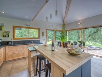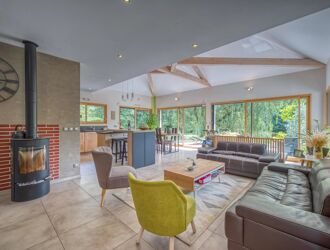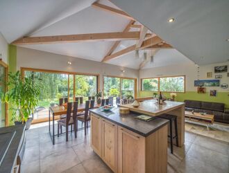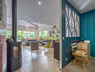 Elle se compose, de plain pied, d’une très grande pièce de vie de 55m², baignée de lumière par de larges baies et fenêtres vitrées à l’est, à l’ouest et au Sud ! La pièce, ouverte, accueille une cuisine complète, un espace salon à proximité du poêle à bois, un espace repas. Elle donne directement sur la grande terrasse et le jardin.