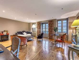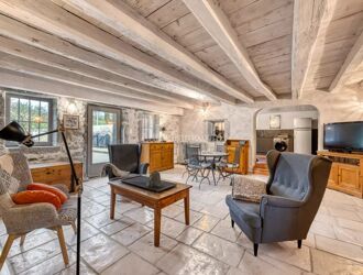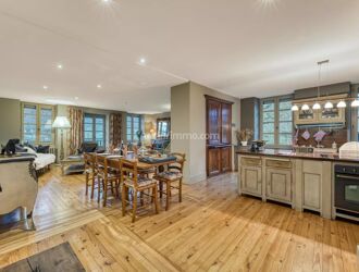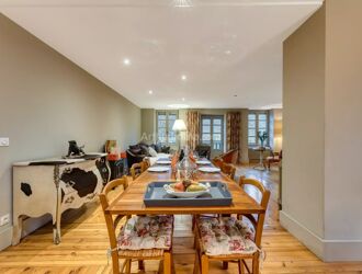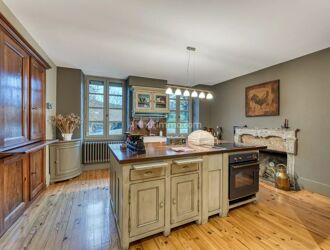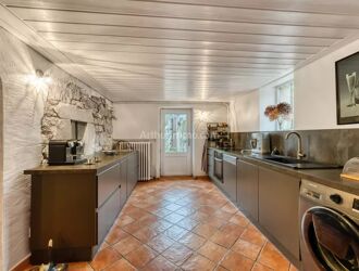 En demi niveau, vous découvrirez un vaste espace de vie que vous réinvestirez dès les chaleurs estivales passées. Intégralement ouvert, cette pièce a été soigneusement organisée pour que chaque espace reste intimiste. La cuisine, d'un style traditionnel et authentique à l'image de ce corps de ferme se trouve en retrait avec une belle cheminée. Le séjour prolonge la cuisine et un magnifique salon s'étend ensuite vers le balcon offrant une vue panoramique du Revard à la Croix du Nivolet. La rénovation a été faite avec goût laissant le charme de l'ancien reprendre vie. Les parquets d'époque ont été ravivés, les carrelages polis, les portes en bois retravaillées, ce qui confère un charme unique à cet intérieur.
